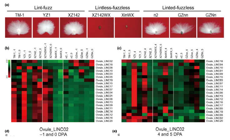 2)結(jié)果發(fā)現(xiàn),編號(hào)為L(zhǎng)INC02在開花期0天左右轉(zhuǎn)錄水平在lint纖維正常發(fā)育株中顯著高于lint纖維缺失株;在開花期5天左右轉(zhuǎn)錄水平fuzz纖維正常發(fā)育株中顯著高于fuzz纖維缺失株;而上述兩個(gè)時(shí)間點(diǎn)分別為兩種棉纖維起始(initiation)時(shí)間點(diǎn),因此,文章認(rèn)為編號(hào)為L(zhǎng)INC02的lncRNA與棉纖維的initiation有關(guān)