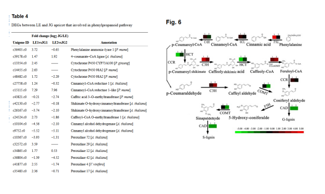 a)LE品種內(nèi)果皮破裂與發(fā)育不全是一個非常復(fù)雜的表型,與眾多的代謝通路相關(guān),但類苯基丙烷相關(guān)通路是眾多代謝通路中已經(jīng)證實的非常重要的一個。該項目中對兩個品種在兩個時間點的差異表達(dá)基因的KEGG富集分析結(jié)果也證實了上述事實,所以差異基因顯著富集于類苯基丙烷代謝、合成等通路。類苯基丙烷相關(guān)通路相關(guān)差異表達(dá)基因見列表4與圖6。