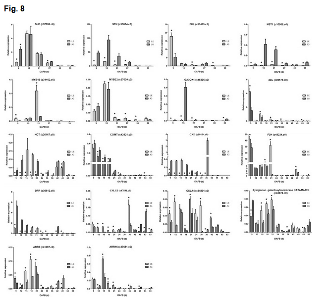 b)一些轉(zhuǎn)錄因子也被報道與內(nèi)果皮發(fā)育相關(guān),包括SHP 、 STK、ALC、IND、FUL、RPL、NST1、NST3以及一些MYB家族轉(zhuǎn)錄因子。該項目中,SHP, FUL, MYB32 ,STK, MYB46–1, MYB46–2, ?NST1 也包含在兩個品種間的差異表達(dá)基因列表中,也發(fā)現(xiàn)了上述部分基因差異表達(dá)方向與預(yù)期不符。