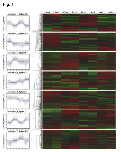 a)文章最后,使用K-means聚類對之前得到的差異表達(dá)基因進(jìn)行了共表達(dá)分析,分析結(jié)果顯示:基于表達(dá)趨勢,所有差異基因可劃分為7個cluster,每個cluster內(nèi)部的基因具有相似的表達(dá)趨勢,也就可能在細(xì)胞內(nèi)行駛著相似的功能,聚類結(jié)果見圖7。 b)之前分析得到的內(nèi)果皮發(fā)育相關(guān)基因大多分布在cluster1或者cluster6,cluster1中的基因在LE品種中高表達(dá),JG品種低表達(dá),cluster6與cluster1相反。