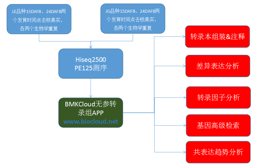 LE品種杏 內(nèi)果皮薄、柔軟、韌性高 JG品種杏 內(nèi)果皮厚、堅硬、韌性低 取樣部位: 去核果實 測序平臺: Illumina HiSeq? 2500 PE125測序