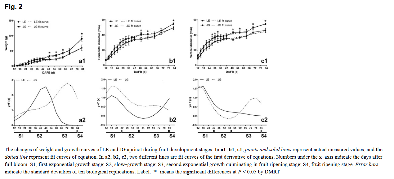 a)如圖2所示,兩種品種杏的果實具有相似的發(fā)育模式,a1、b1、c1是以開花后時間(DAFB)為橫坐標(biāo),分別以果實重量、果實長度、果實寬度為縱坐標(biāo)做圖,兩種杏的果實均呈現(xiàn)出了“雙S曲線”生長模式,圖a2、b2、c2是分別對a1、b1、c1一階導(dǎo)數(shù)作圖,兩種果實同樣也表現(xiàn)出相似的趨勢。 根據(jù)生長曲線,研究者將果實的發(fā)育劃分為4個時期:第一次指數(shù)生長期(before 30DAFB)、緩慢生長期(30-49DAFB)、第二次指數(shù)生長期(49-83DAFB)、成熟期(after 83DAFB)。