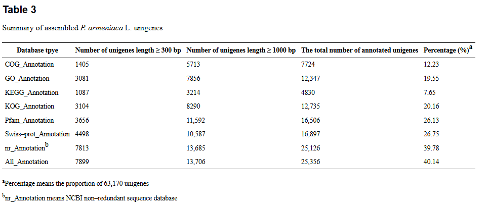 a)基于blast比對,63,170條unigene中有25,356可比對到日本杏(Japanese apricot)與桃(peach)基因組數(shù)據(jù)庫。 b)使用BLASTx(e-value閾值設(shè)為10e-5)將上述25,356條unigene比對到NR, Swiss-Port, GO, COG, KOG ,kegg數(shù)據(jù)庫以進(jìn)行功能注釋,每條unigene均有多條注釋,詳細(xì)的注釋結(jié)果統(tǒng)計信息請參見表3. c)GO數(shù)據(jù)庫注釋過程中,16,506條unigene被注釋到,其中, ‘metabolic process’ (8408 genes, 50.93%)是被注釋到最多的GO 條目;KEGG數(shù)據(jù)庫注釋過程中,4830條unigene被注釋到了118個代謝通路。大部分的unigene被注釋到了‘carbohydrate metabolism’ (905 genes), ‘translation’ (596 genes), ‘a(chǎn)mino acid metabolism’ (581 genes), or ‘folding, sorting and degradation’ (471 genes)等代謝通路。