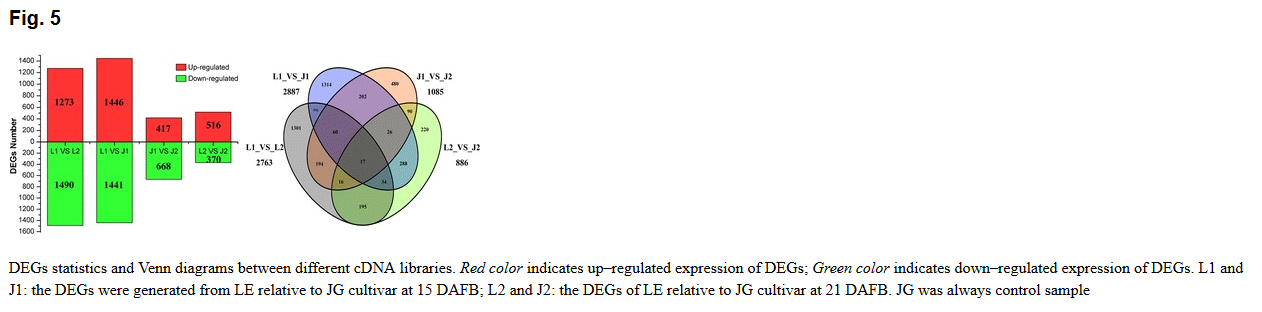使用DESeq進(jìn)行了差異表達(dá)基因檢測,差異表達(dá)基因篩選閾值為:FDR<0.01,F(xiàn)C > 2 。15DAFB時間點上,兩個品種間檢測到差異表達(dá)基因2887個,24DAFB時間點上,兩個品種間檢測到差異表達(dá)基因886個,具體上下調(diào)、共有特有情況請參見圖5.