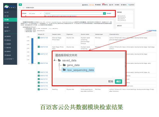 1)下載大豆RNA-seq公共數(shù)據(jù)集: 數(shù)據(jù)集1 SRA數(shù)據(jù)庫(kù)編號(hào):PRJNA140081. 包含14個(gè)樣本,其中11個(gè)樣本為生殖組織來(lái) 源(花、豆莢、種子),3個(gè)為營(yíng)養(yǎng)組織來(lái)源(葉、根、根瘤) 數(shù)據(jù)集2 GEO數(shù)據(jù)庫(kù)編號(hào): GSE29163. 包含10個(gè)樣本,其中6個(gè)樣本為生殖組織來(lái)源(花、花芽、種子),4個(gè)樣本為營(yíng)養(yǎng)組織來(lái)源(根、莖、葉、幼苗) 該步驟可進(jìn)入BMKCloud_數(shù)據(jù)庫(kù)模塊按數(shù)據(jù)編號(hào)完成數(shù)據(jù)檢索及一鍵保存,保存后的數(shù)據(jù)可直接調(diào)用百邁云平臺(tái)的分析模塊BMKCloud_APP進(jìn)行后續(xù)分析。