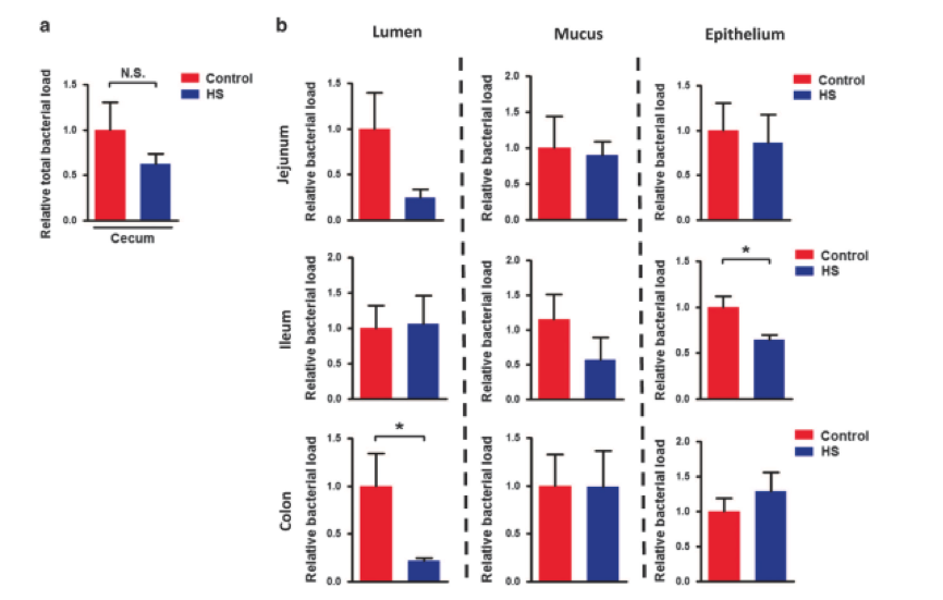 首先,研究人員檢查HS攝入是否會(huì)影響腸道細(xì)菌。慢性HS喂養(yǎng)后,盲腸中的總細(xì)菌負(fù)荷略有下降,但無(wú)顯著變化(圖1a)。慢性HS喂養(yǎng)后,回腸上皮(圖1b)和結(jié)腸腔內(nèi)(圖1b)的細(xì)菌負(fù)荷也降低。慢性HS處理顯著降低厚壁菌門和提高擬桿菌的水平,這表明細(xì)菌組合物在HS攝入后發(fā)生改變。