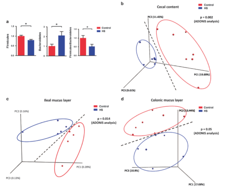 為了研究HS攝入如何影響腸道微環(huán)境,研究人員將HS組的細(xì)菌組成與對(duì)照組相比,在HS處理后,盲腸中Actinobacteria,F(xiàn)irmicutes和Bacteroidetes在門水平和Actinobacteria以及Clostridia和Bacteroidia的百分比顯著不同。unweighted uniFrac分析結(jié)果顯示HS和對(duì)照組分別聚集(圖2b)。進(jìn)一步分析顯示,HS和對(duì)照組在回腸粘液層分別聚集(圖2c),而對(duì)照組和HS組形成兩個(gè)聚類,分離趨勢(shì)明顯在結(jié)腸粘液層(圖2d)。研究結(jié)果表明,慢性HS喂養(yǎng)可能導(dǎo)致腸道生態(tài)失調(diào),細(xì)菌計(jì)數(shù)和微環(huán)境組成的變化也證明了這一點(diǎn)。