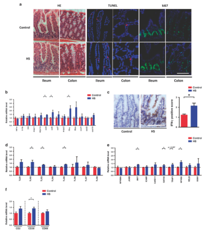 腸道生態(tài)失調(diào)通常與腸道病理生理學(xué)的改變有關(guān),研究人員檢查了慢性HS喂養(yǎng)對(duì)腸道變化的影響。在對(duì)照組和HS-喂養(yǎng)組小鼠的回腸和結(jié)腸上皮細(xì)胞形態(tài)沒有差異(圖3a)。此外,通過(guò)TUNEL和ki67染色鑒定的相似數(shù)量凋亡和增殖細(xì)胞表明,慢性HS喂養(yǎng)不影響腸道中的細(xì)胞死亡(圖3a)。然而,研究人員發(fā)現(xiàn)炎癥標(biāo)志物表達(dá)被慢性HS攝入顯著改變。特別是,Ccl4,Ccl5和Ifn-γ在HS小鼠的回腸中表現(xiàn)出更高的mRNA水平(圖3b)。 IFN-γ免疫組織化學(xué)在回腸中的結(jié)果證實(shí)了基因表達(dá)數(shù)據(jù)(圖3c)。由于TLR家族蛋白和Nf-κB是參與病原體相關(guān)免疫應(yīng)答的主要分子,進(jìn)一步評(píng)估TLR家族和Nf-κB基因表達(dá),發(fā)現(xiàn)TLR2,TLR3和TLR5mRNA水平在回腸中趨于更高(圖3d)。同時(shí),HS處理后IRF7,GATA3和NFKB2的表達(dá)顯著上調(diào)(圖3e)。此外,HS喂養(yǎng)后白細(xì)胞中CD38的表達(dá)在回腸中升高(圖3f)。然后通過(guò)RNA測(cè)序進(jìn)行轉(zhuǎn)錄組分析,并比較涉及“細(xì)胞因子 – 細(xì)胞因子受體相互作用”,“ NF-κB信號(hào)通路“和”Toll樣受體信號(hào)通路“。在回腸和結(jié)腸中,兩組之間許多基因的表達(dá)是不同的??偟膩?lái)說(shuō),這些數(shù)據(jù)表明慢性HS攝入導(dǎo)致腸炎癥反應(yīng)中斷。