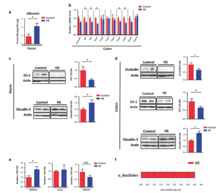 腸道免疫反應(yīng)受損始終與腸道屏障功能障礙有關(guān),研究人員研究了HS的攝入如何影響腸道屏障功能。HS攝入顯著降低了tjp-1,tjp-2,claudin-1,claudin-7和claudin-8基因的表達(dá)(圖4a)。 此外,與對(duì)照小鼠相比,HS攝入后,回腸和結(jié)腸中屏障形成的緊密連接ZO-1蛋白水平和結(jié)腸中的Occludin蛋白水平顯示出較低的趨勢(shì)(圖4c和d)。 另一方面,在HS喂養(yǎng)回腸和結(jié)腸后,成孔緊密連接蛋白Claudin-2蛋白水平顯著較高(圖4c和d)。這些數(shù)據(jù)清楚地表明腸道腸道屏障被慢性HS攝入所破壞。