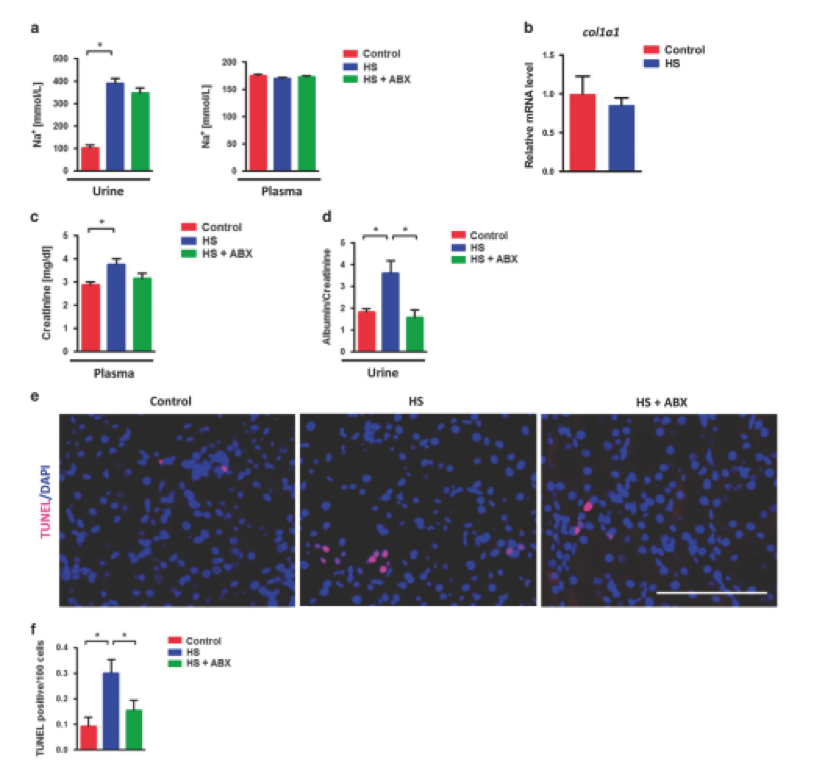 為了進(jìn)一步闡明HS攝入后腸道生態(tài)失調(diào)和腎損傷之間的關(guān)系,給小鼠喂養(yǎng)多粘菌素B和新霉素??股亟o藥確實(shí)恢復(fù)了HS飼喂誘導(dǎo)的回腸Ifn-γ過(guò)表達(dá),通過(guò)糞便白蛋白和FD-4滲透監(jiān)測(cè)腸道泄漏,以及通過(guò)血漿內(nèi)毒素水平和腎臟16s / 18s比率監(jiān)測(cè)的細(xì)菌移位,通過(guò)尿和血漿Na +濃度測(cè)量,抗生素不改變鈉負(fù)荷(圖5a)。雖然8周HS喂養(yǎng)并未引起纖維化等進(jìn)展性腎損傷,但由col1a1 mRNA水平監(jiān)測(cè)(圖5b),HS喂養(yǎng)增加了血漿肌酐水平。更重要的是,與對(duì)照組小鼠相比,HS-喂養(yǎng)小鼠腎功能障礙的主要標(biāo)志物尿白蛋白/肌酐比率顯著增加,抗生素治療幾乎可以完全恢復(fù)腎功能(圖5d)。另外,TUNEL染色顯示抗生素施用可以降低HS誘導(dǎo)的凋亡細(xì)胞的升高(圖5e和f)。總之,該數(shù)據(jù)表明,抗生素治療能夠改善腸道滲漏和HS喂養(yǎng)引起的早期腎損傷。