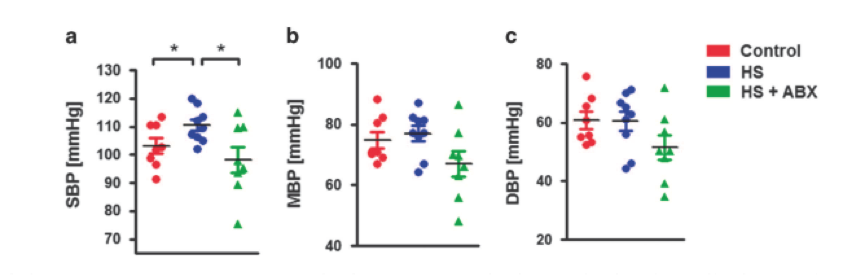 慢性HS喂養(yǎng)可能導(dǎo)致動(dòng)脈壓升高,并且研究人員還檢測(cè)到抗生素如何影響這種進(jìn)展。 如圖6所示,雖然HS處理的小鼠的DBP和平均血壓沒有增加,但是慢性HS喂養(yǎng)后SBP明顯升高。 有趣的是,抗生素治療能夠完全恢復(fù)海拔。 這些數(shù)據(jù)強(qiáng)烈表明慢性HS喂養(yǎng)引起的SBP升高取決于腸道微生物群。