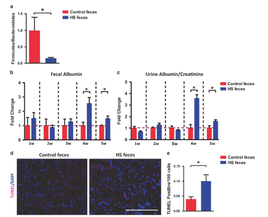 最后,為了進(jìn)一步證明腸道微生物群是腎損傷發(fā)展的上游因素,進(jìn)行了糞便微生物群移植實(shí)驗(yàn)。喂食正常飲食(不是高鹽)的兩組小鼠口服來(lái)自對(duì)照和HS處理的小鼠的糞便。8周后,接受對(duì)照糞便的對(duì)照小鼠的盲腸壁Firmicutes/Bacteroidetes比例(其是微生物群組成改變的主要標(biāo)志)顯著高于接受HS糞便的HS小鼠,其為 與研究人員之前的數(shù)據(jù)一致,表明HS喂養(yǎng)降低了盲腸中的Firmicutes / Bacteroidetes比例,并證明該糞便微生物群移植實(shí)驗(yàn)是成功的(圖7a)。此外,如圖7b和c所示,給藥后4周,由糞便白蛋白含量監(jiān)測(cè)的腸道通透性在接受HS喂養(yǎng)糞便的小鼠中顯著增加,并且重要的是,尿白蛋白/肌酸酐比率(目前研究中觀察到的腎功能障礙的主要表型)在移植后4周接受HS喂養(yǎng)的糞便的小鼠中也顯著增加。最后,與對(duì)照小鼠相比,HS糞便移植小鼠中腎臟凋亡細(xì)胞的數(shù)量顯著增加(圖7d和e)。這些數(shù)據(jù)進(jìn)一步表明,HS喂養(yǎng)引起的腸道生態(tài)失調(diào)是腎損傷和功能障礙的原始誘因。
