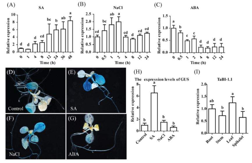 研究者創(chuàng)建了含有1.7kb TaBI-1.1啟動(dòng)子并生成轉(zhuǎn)基因擬南芥的PBI :: GUS融合構(gòu)建體,以研究TaBI-1.1的空間表達(dá)模式。使用GUS染色測(cè)定組織GUS活性。在成熟葉和根中有TaBI-1.1表達(dá),但在下胚軸和幼葉中觀察不到(圖1D)。還檢測(cè)了各種小麥組織中的TaBI-1.1表達(dá)水平,包括根,莖,葉和小穗,結(jié)果表明TaBI-1.1的表達(dá)在這些小麥組織中普遍存在,而且在葉中最高,在小穗中最低(圖1I)。在SA和NaCl處理之后,成熟葉中的表達(dá)與對(duì)照相比增加,并且SA處理的表達(dá)更高。當(dāng)SA和NaCl處理時(shí),在下胚軸中也檢測(cè)到表達(dá)(圖1E,F(xiàn))。在ABA處理的植物的葉子中檢測(cè)到較弱的表達(dá)(圖1G)。通過qRT-PCR進(jìn)一步證實(shí)GUS表達(dá)水平(圖1H)。以上結(jié)果表明,TaBI-1.1在各種脅迫下均有表達(dá)。