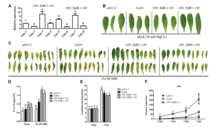 圖2. TaBI-1.1轉(zhuǎn)基因擬南芥對(duì)Pst DC3000的抗性增強(qiáng)
