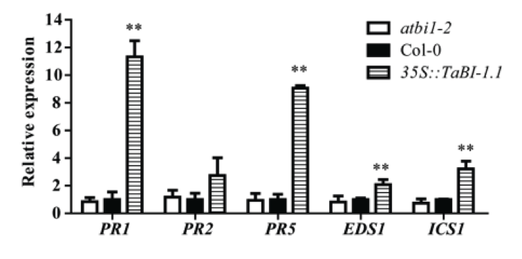 PR基因表達(dá)與SA積累和系統(tǒng)獲得性抗性(SAR)有關(guān)。進(jìn)一步檢測(cè)了常規(guī)條件下生長(zhǎng)2周齡Col-0,atbi1-2和35S :: TaBI-1.1#1幼苗中SA相關(guān)基因的表達(dá)。與Col-0和atbi1-2相比,在35S :: TaBI-1.1中觀察到PR1,PR5,ICS1和EDS1有顯著高表達(dá)水平。 然而,在這些基因表達(dá)水平中Col-0和atbi1-2之間沒有檢測(cè)到顯著差異(圖3)。 與Col-0相比,35S :: TaBI-1.1中PR1和PR5的表達(dá)水平分別增加了約11倍和9倍。 PR2,ICS1和EDS1表達(dá)的倍數(shù)變化低于PR1和PR5表達(dá)的變化(圖3)。因此,TaBI-1.1上調(diào)PR1,PR2,PR5,ICS1和EDS1基因的表達(dá),表明 TaBI-1.1在SA信號(hào)傳導(dǎo)中起正向調(diào)節(jié)作用。
