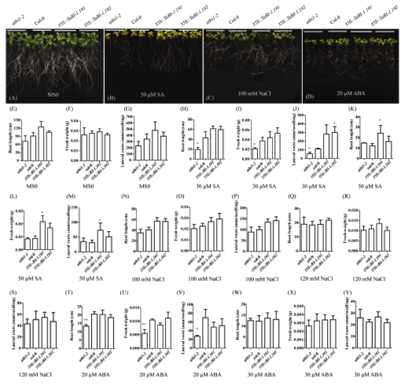 圖4. 在含有SA,NaCl或ABA的MS培養(yǎng)基上生長(zhǎng)的atbi1-2,Col-0和35S :: TaB-1.1幼苗根長(zhǎng),鮮重和側(cè)根數(shù)的統(tǒng)計(jì)分析。