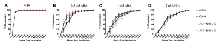 研究者進(jìn)一步研究了TaBI-1.1在發(fā)芽過程中對(duì)ABA的敏感性。 在不同濃度的ABA的培養(yǎng)基上每12小時(shí)記錄發(fā)芽種子的百分比。在MS0培養(yǎng)基中,Col-0,atbi1-2和35S :: TaBI-1.1轉(zhuǎn)基因擬南芥植物顯示相似的發(fā)芽率(圖5A)。 含有0.5μMABA的培養(yǎng)基中,兩種轉(zhuǎn)基因株系萌發(fā)顯著快于Col-0和atbi1-2(圖5B)。 在含有1μMABA的培養(yǎng)基上觀察不到顯著差異(圖5C)。 在含有2μMABA的培養(yǎng)基上,Col-0和兩種轉(zhuǎn)基因品系也比atbi1-2稍快地萌發(fā)(圖5D)。 以上結(jié)果表明,TaBI-1.1轉(zhuǎn)基因擬南芥對(duì)ABA的敏感性較低。