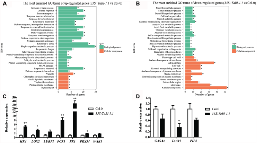 研究人員對(duì)35S :: TaBI-1.1#1和Col-0植物進(jìn)行了RNA-seq分析,以更好地理解TaBI-1.1功能。鑒定出48個(gè)上調(diào)基因和58個(gè)下調(diào)基因并做了一個(gè)熱圖。使用GO分析將差異表達(dá)的基因功能分類。富集了30多個(gè)GO terms,如圖6所示。對(duì)于上調(diào)的基因,富集的GO terms主要集中在抗生物脅迫,細(xì)胞免疫應(yīng)答和SA合成與代謝相關(guān)的生物過程上。前10個(gè)關(guān)鍵的Go terms分別是防御反應(yīng)、對(duì)外部刺激的反應(yīng)、對(duì)生物刺激的反應(yīng)、對(duì)外部生物刺激的反應(yīng)、多生物體過程、對(duì)另一個(gè)生物體的反應(yīng)、對(duì)另一個(gè)生物體的防御反應(yīng)、對(duì)壓力的反應(yīng)、單一生物體代謝過程和對(duì)化學(xué)物質(zhì)的反應(yīng)(圖6A)。對(duì)于下調(diào)的基因,富集的GO terms集中在細(xì)胞組分上,并且前三項(xiàng)是細(xì)胞組分,膜和細(xì)胞周圍(圖6B)。選擇七個(gè)上調(diào)基因和三個(gè)下調(diào)基因進(jìn)行qRT-PCR實(shí)驗(yàn),結(jié)果表明,qRT-PCR結(jié)果與RNA-seq分析一致。