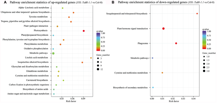 KEGG富集分析差異表達(dá)基因被呈現(xiàn)為散點(diǎn)圖。 使用富集因子、q值和通路中富集的基因數(shù)量來測(cè)量富集程度。 富集因子越高表示富集程度越高。觀察到上調(diào)基因富集了20多個(gè)KEGG通路。上調(diào)基因的前20個(gè)富集通路中,其中光合作用是最明顯的富集途徑(圖7A)。 光合作用的富集因子達(dá)到0.09,而q值大約為0。相反,下調(diào)基因的KEGG富集通路并不明顯,只有6個(gè)富集因子較低的通路被鑒定出來(圖7B)。因此,TaBI-1.1參與對(duì)生物脅迫的應(yīng)答并主要通過基因上調(diào)表達(dá)來執(zhí)行其防御功能。