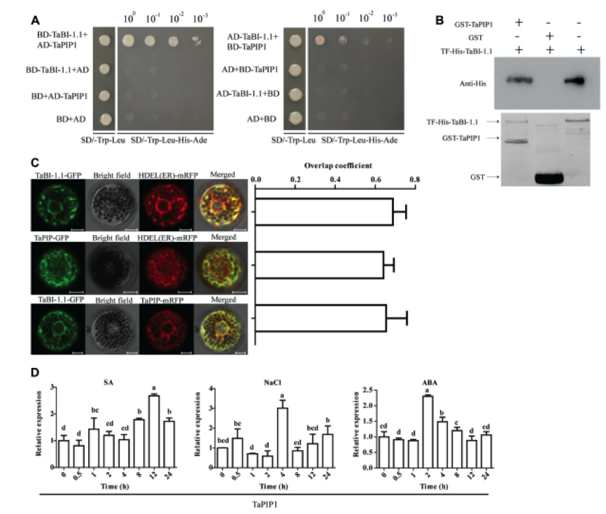 AtBI-1定位于ER膜上,研究者在小麥原生質(zhì)體中檢測(cè)了TaBI-1.1-GFP和mRFP-HDEL的共定位以確定TaBI-1.1的亞細(xì)胞定位。GFP和mRFP熒光的重疊系數(shù) 是0.69,表明TaBI-1.1與ER膜上的HDEL共定位(圖8C)。 鑒于TaBI-1.1和TaPIP1之間的相互作用,研究者還檢測(cè)到TaPIP1-GFP和mRFP-HDEL之間的共定位以及TaBI-1.1-GFP和TaPIP1-mRFP在小麥原生質(zhì)體中的共定位(圖8C)。 結(jié)果顯示TaBI-1.1和TaPIP1共定位于ER膜。